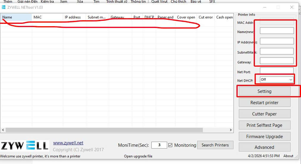 Việc đổi IP máy in hóa đơn Zywell ZY303, ZY307, N1 rất đơn giản nếu dùng đúng driver + tool chính hãng.